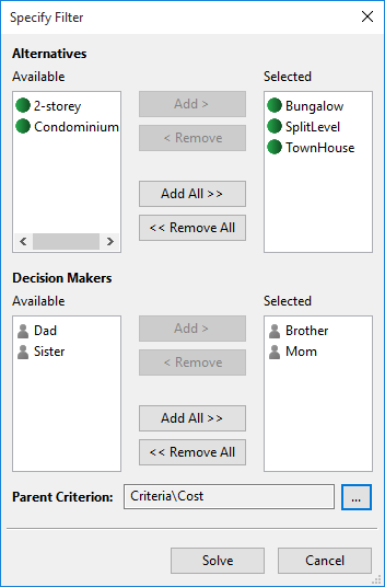 You can specify a subset of alternatives, decision makers (Tetra GDM only), and a branch of the criteria tree. Selected alternatives and decision makers are shown on the right-hand side. To remove an item, select it and press <-Remove or double click the item. To add an item back into the list, select it in the list on the left, and click Add-> or double click the item. You can add or remove all alternatives or decision makers by clicking corresponding buttons. You can also choose a specific branch of the criteria tree. Click on the ... button to the right of the Parent Criterion Node field, and browse to criterion you wish to specify as the parent. This will generate a solution based on the ratings for all criteria below, and including, the selected criterion.